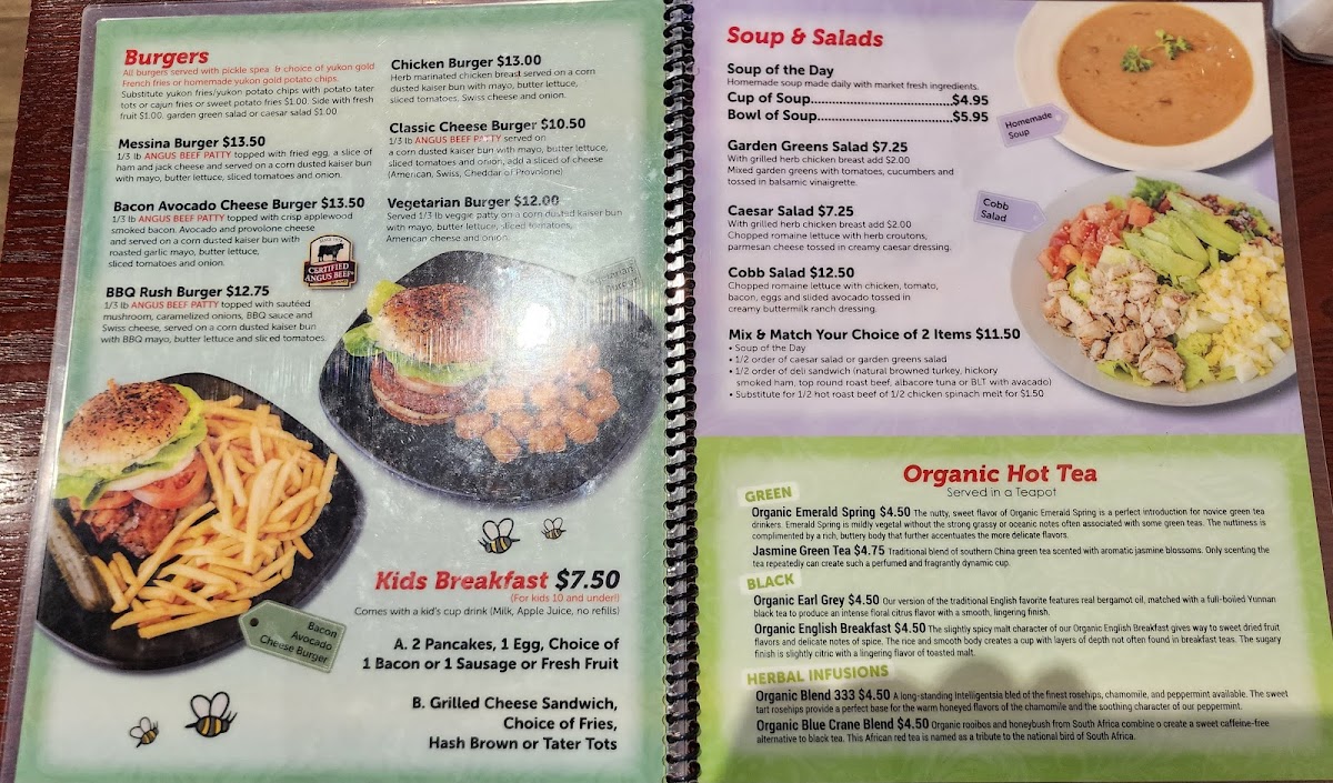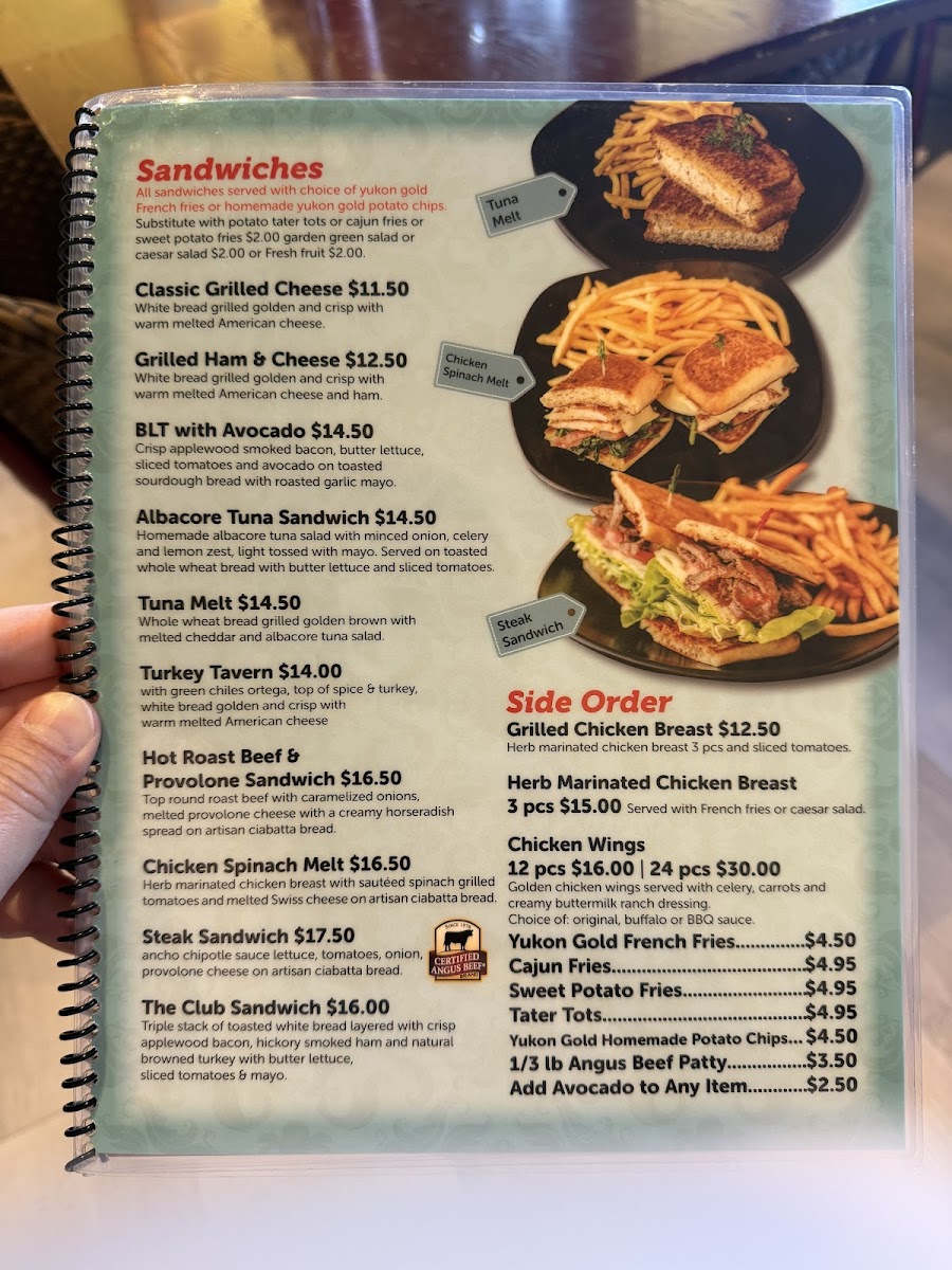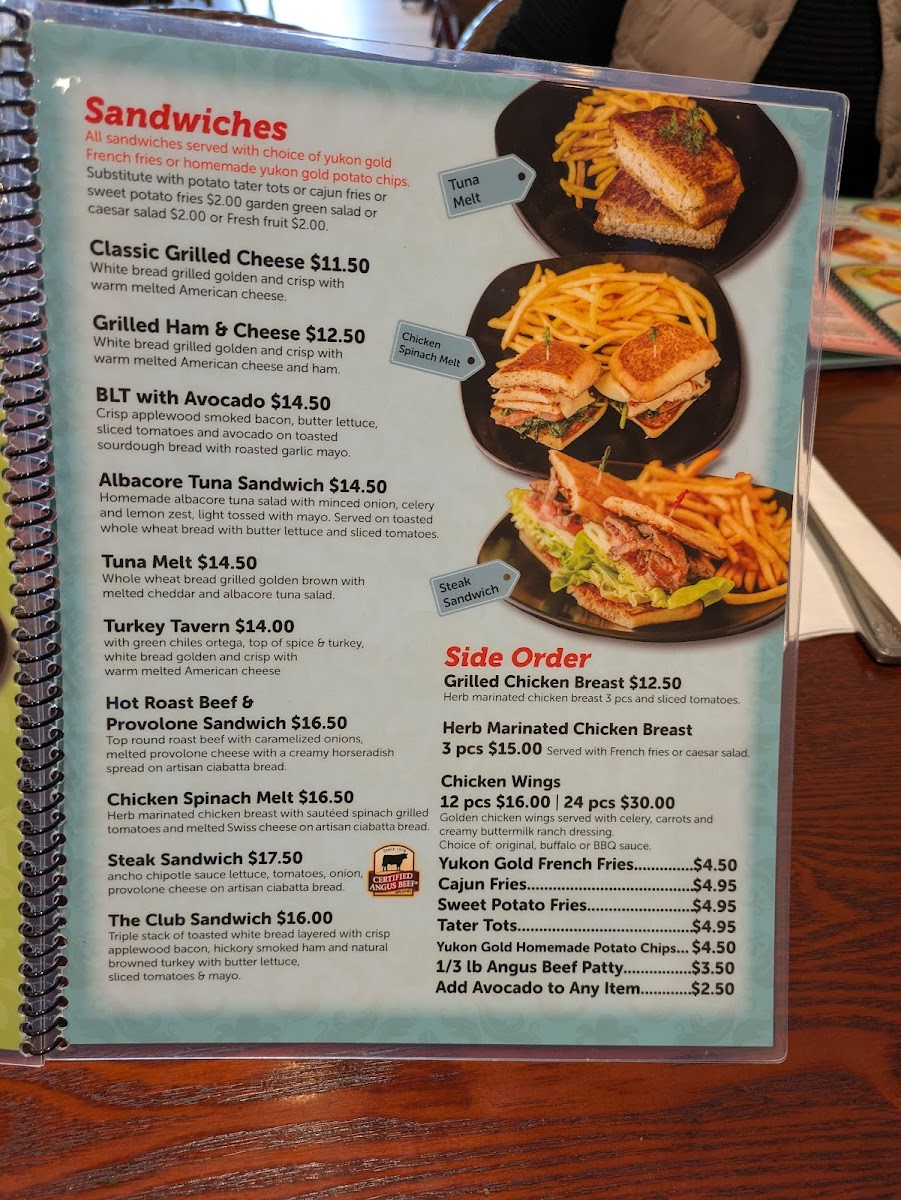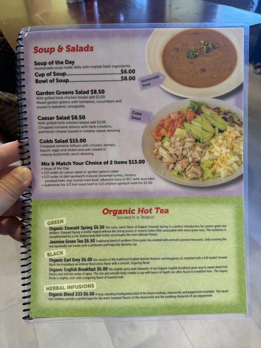 soup of the day 1/2 order of caesar salad or garden greens salad natural browned turkey, hickory smoked ham, top round roast beef, albacore tuna, or blt w/ avocado substitute 1/2 hot rast beef or 1/2 chicken spinach melt